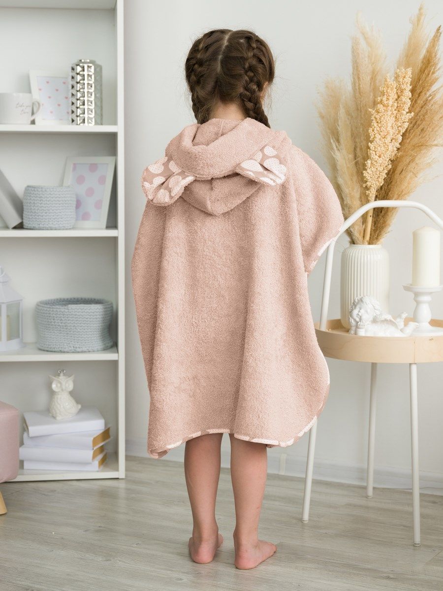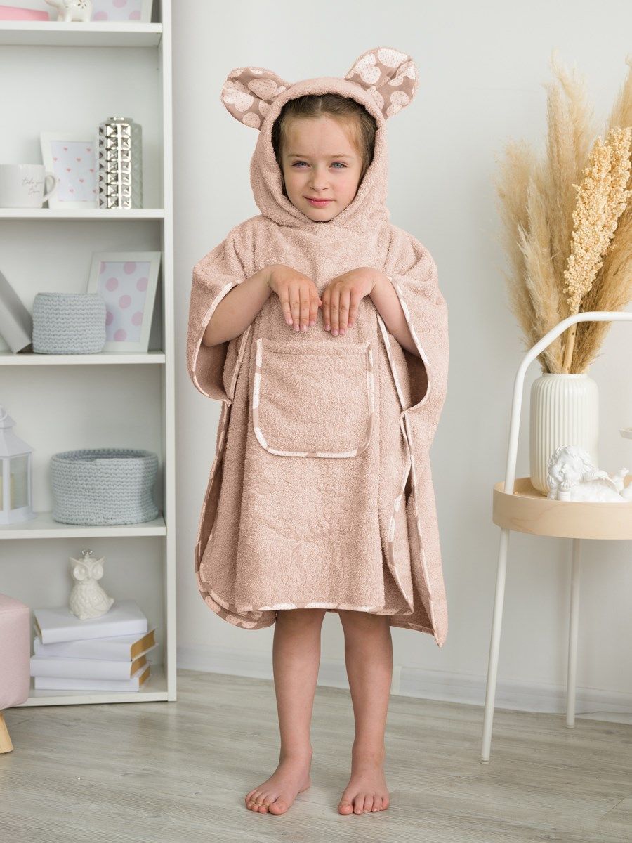 Пончо для детей станет интересной альтернативой банному полотенцу или домашнему халату после купания, для посещения сауны или бассейна. Капюшон с ушами мышки, вместительный фронтальный карман и контрастная бязевая отделка делают модель максимально удобной и ещё более стильной.