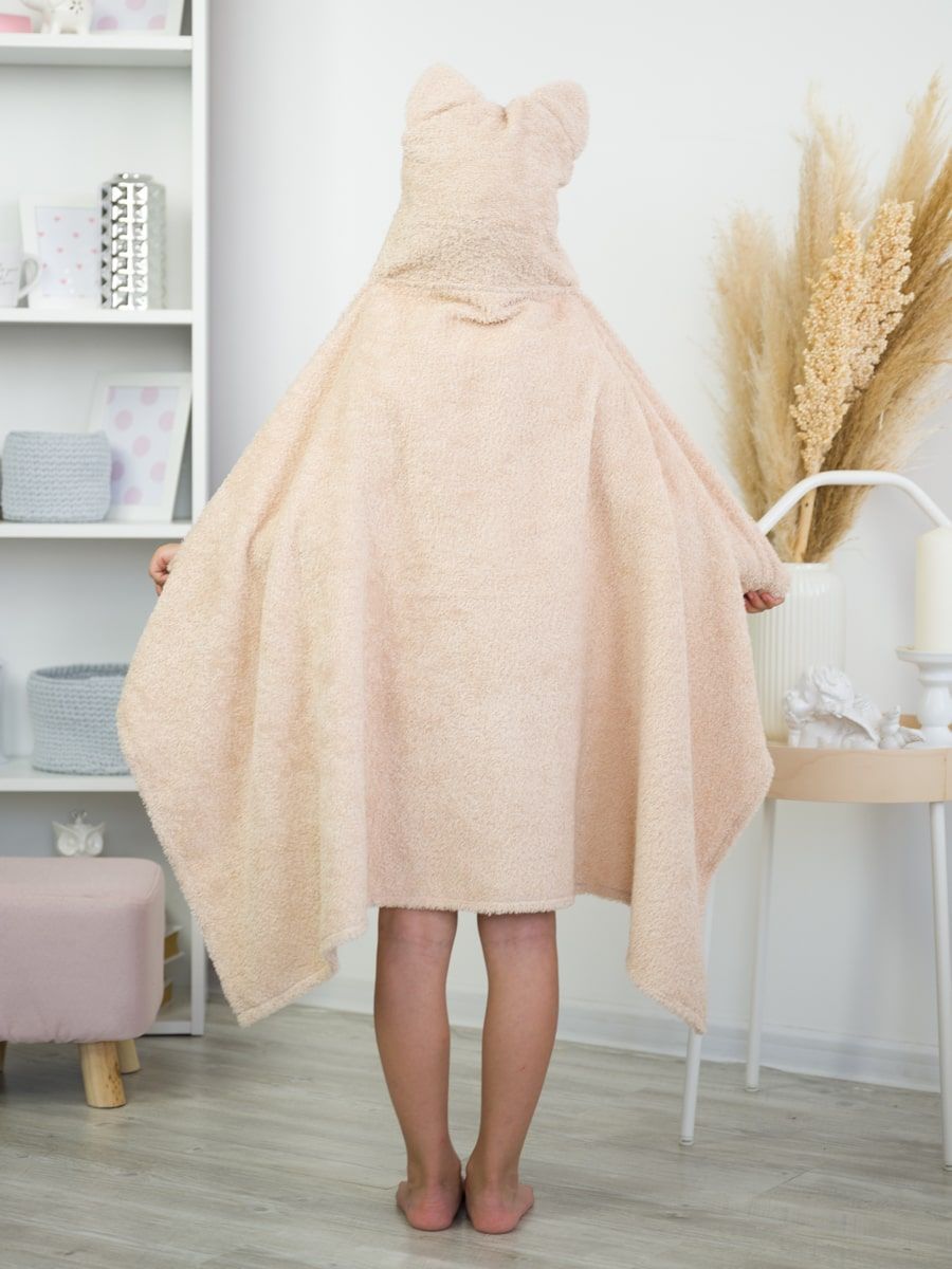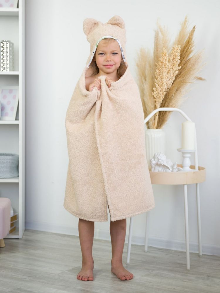 Большое полотенце с ушами кота станет незаменимым аксессуаром после купания как для новорождённых малышей, так и для подросших девочек ростом до 120 см.